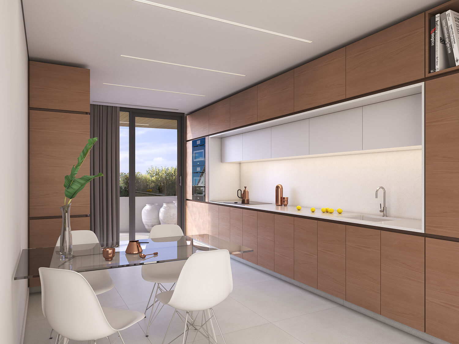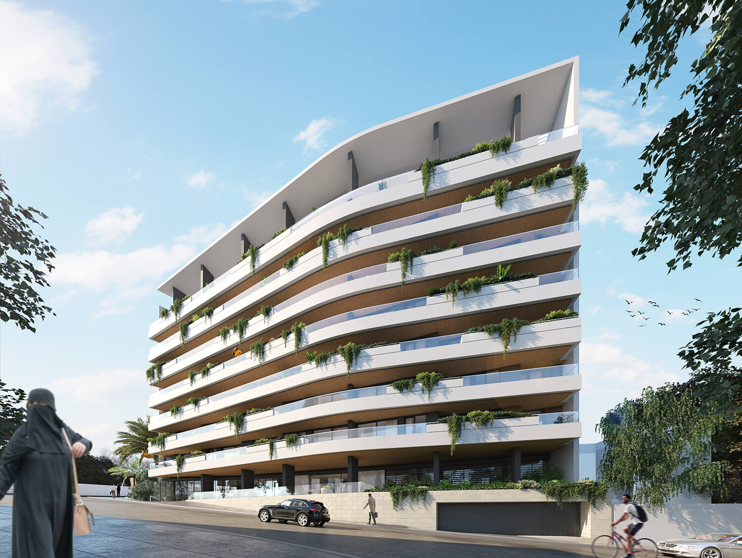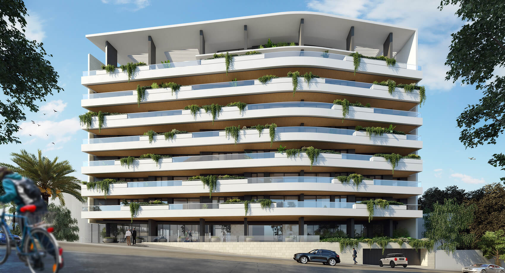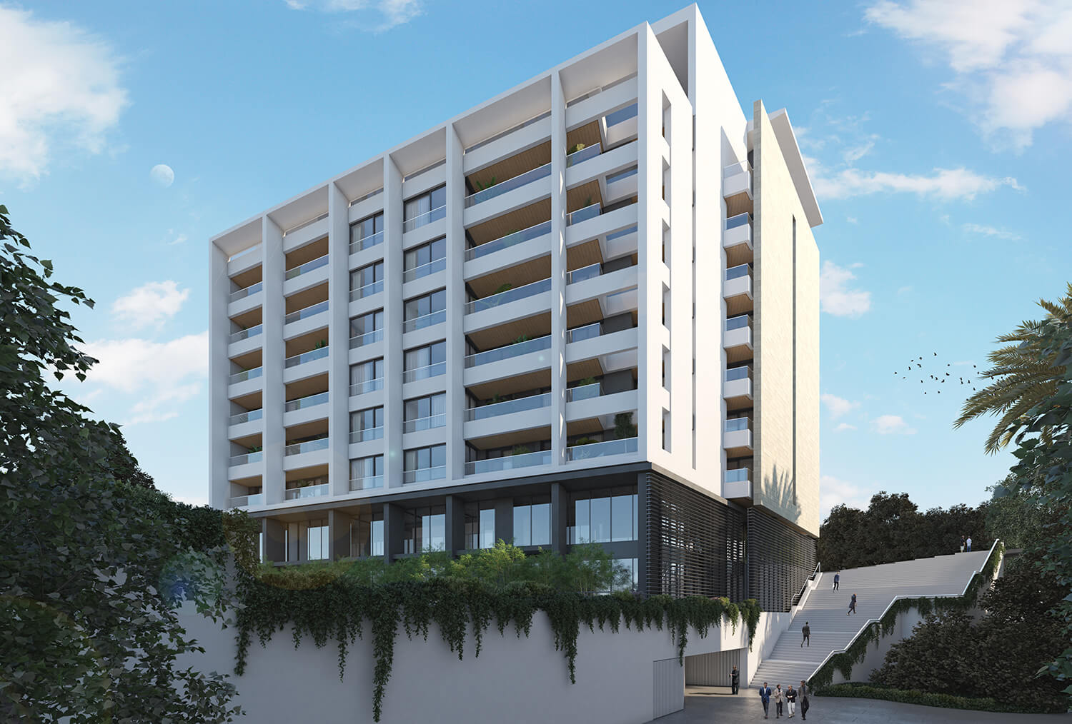 Proyecto de edificio de 32 viviendas con apartamentos 2, 3 y 4 dormitorios, aparcamiento privado, y 2 niveles destinados a oficinas. Las viviendas se disponen en planta baja (que dado el desnivel de la parcela, se ubica a más de 3,00 m de la acera), 5 plantas más dúplex.