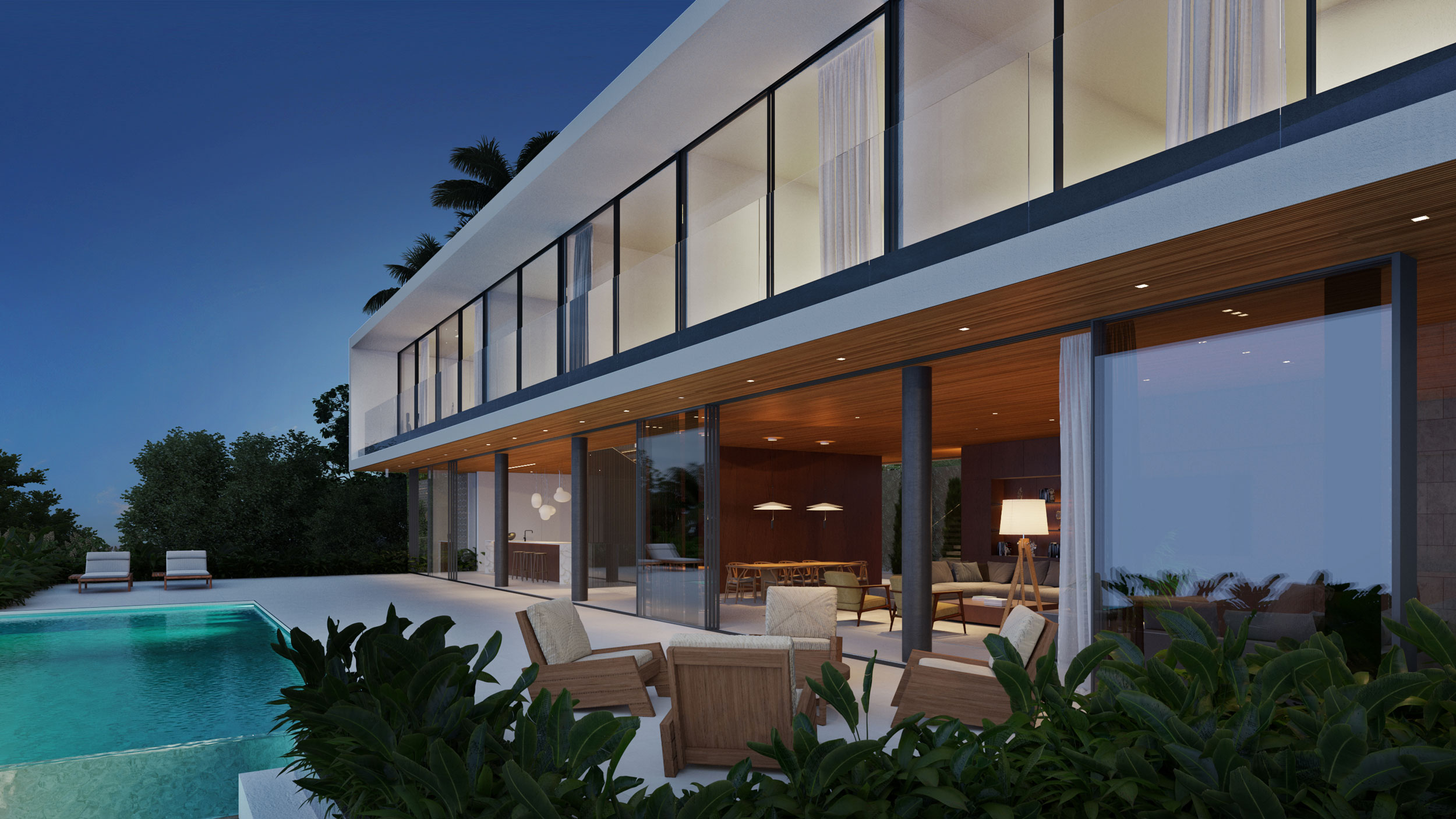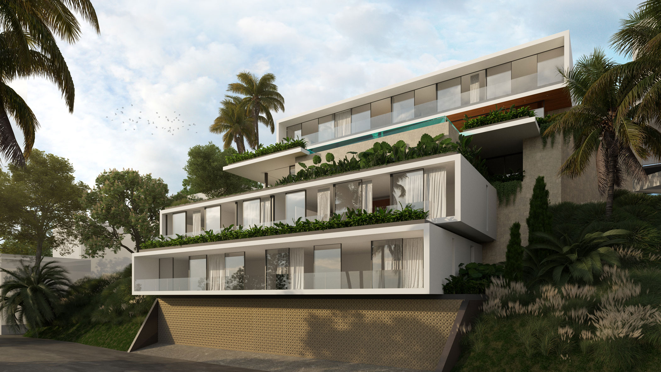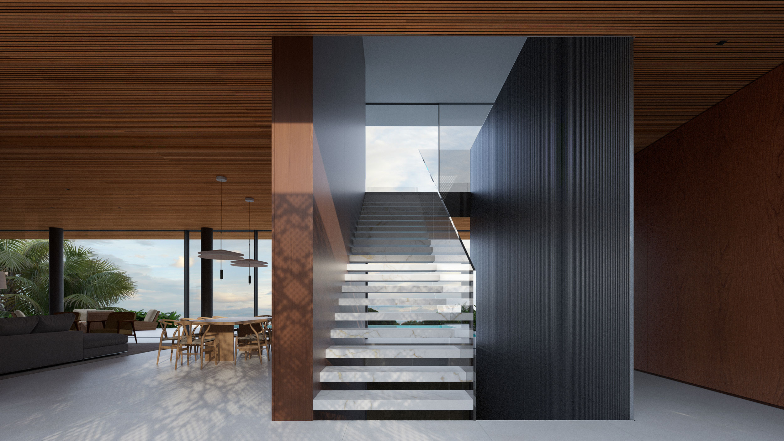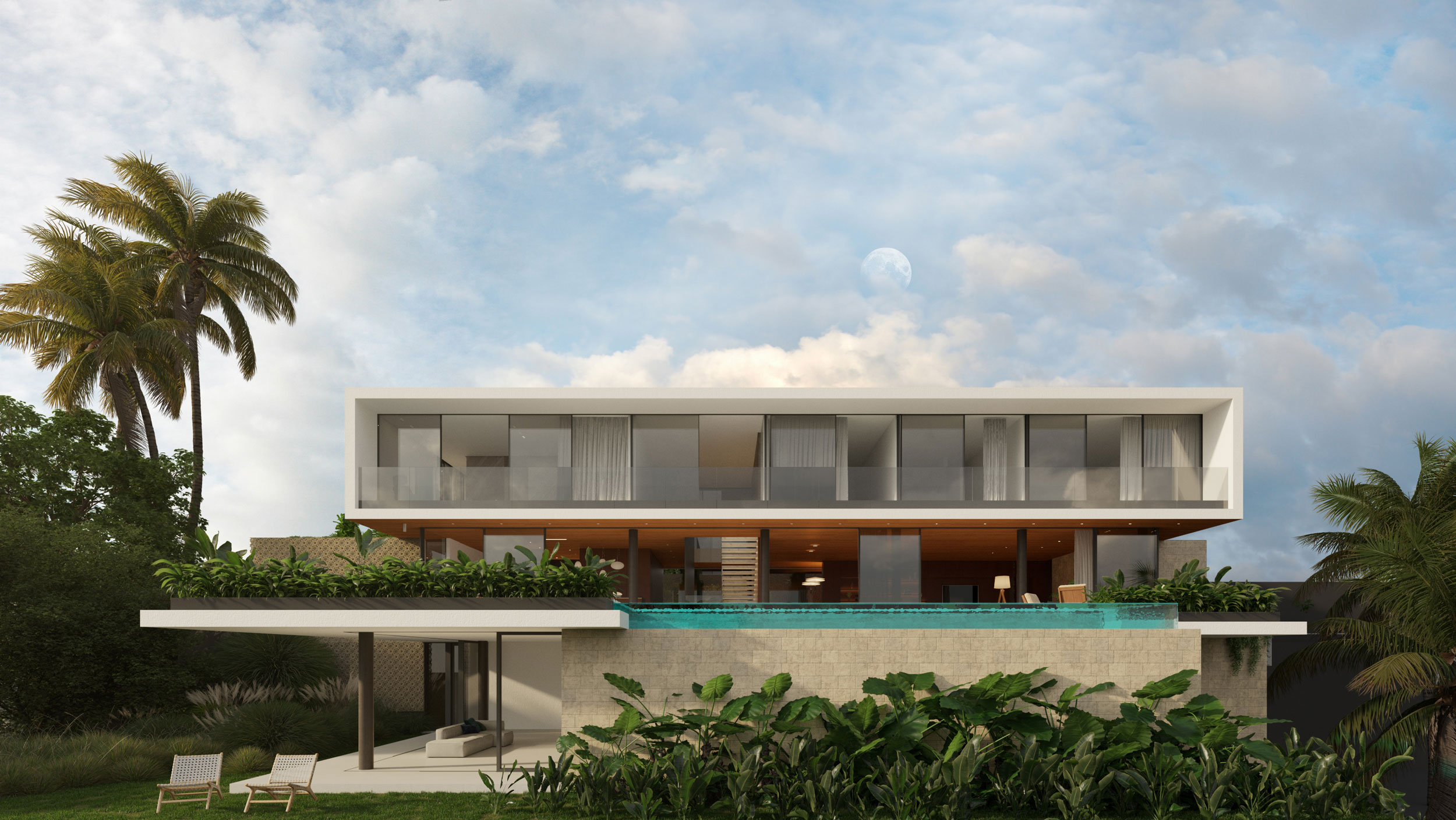 En la planta baja se plantea el acceso principal, un gran estar y comedor, cocina y comedor diario, el acceso al garaje para 2 vehículos y zonas de terraza exterior, piscina y jardín. En planta alta se ubican 4 dormitorios más balcón terraza A las 2 viviendas para renta se accede desde el vial inferior. En ese nivel se ubica las áreas de aparcamiento y el hall de acceso a las viviendas que se desarrollan en planta primera y segunda.