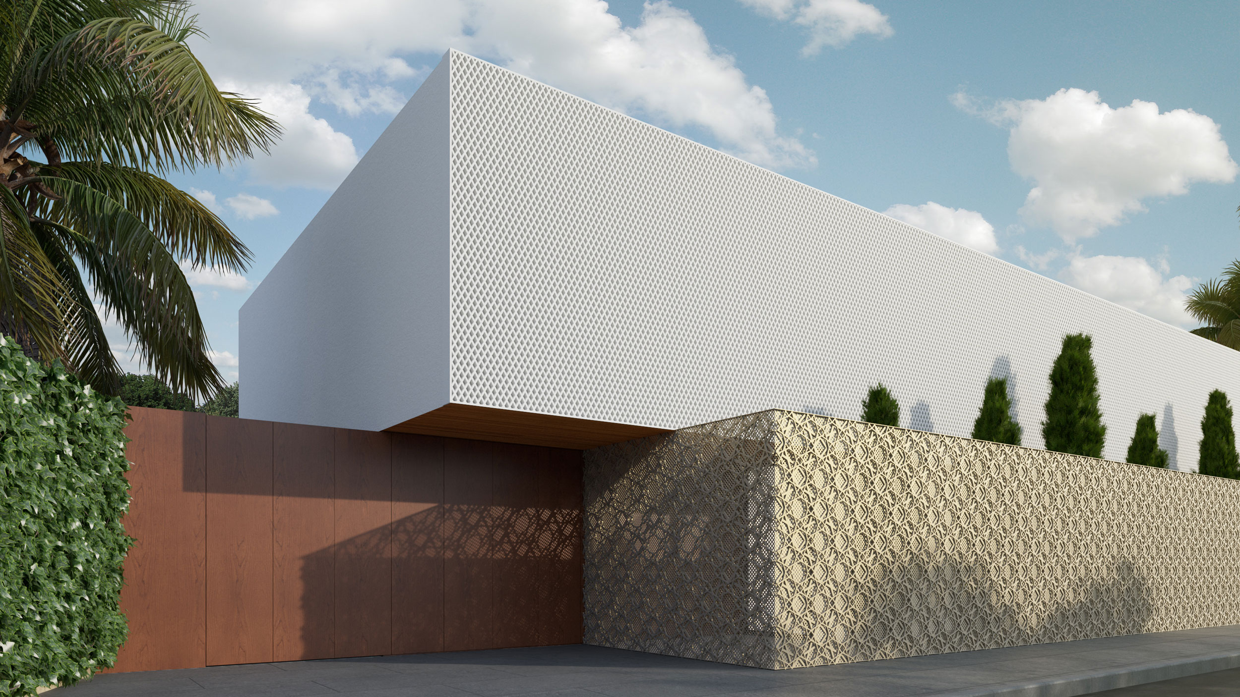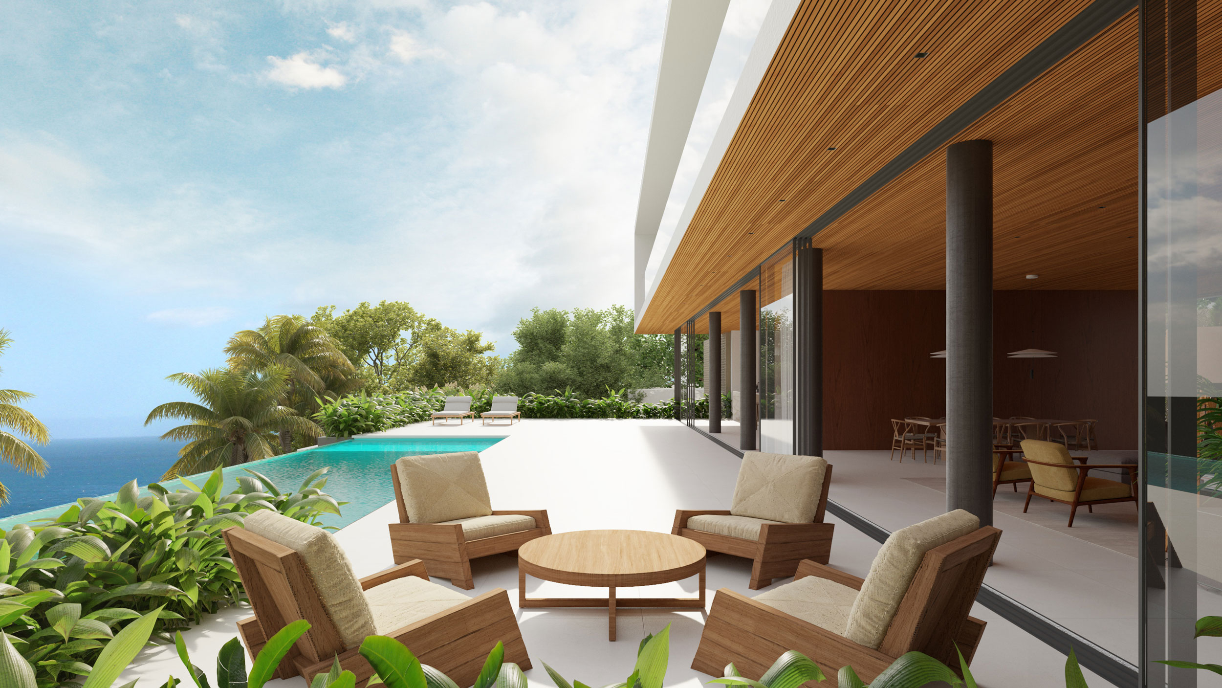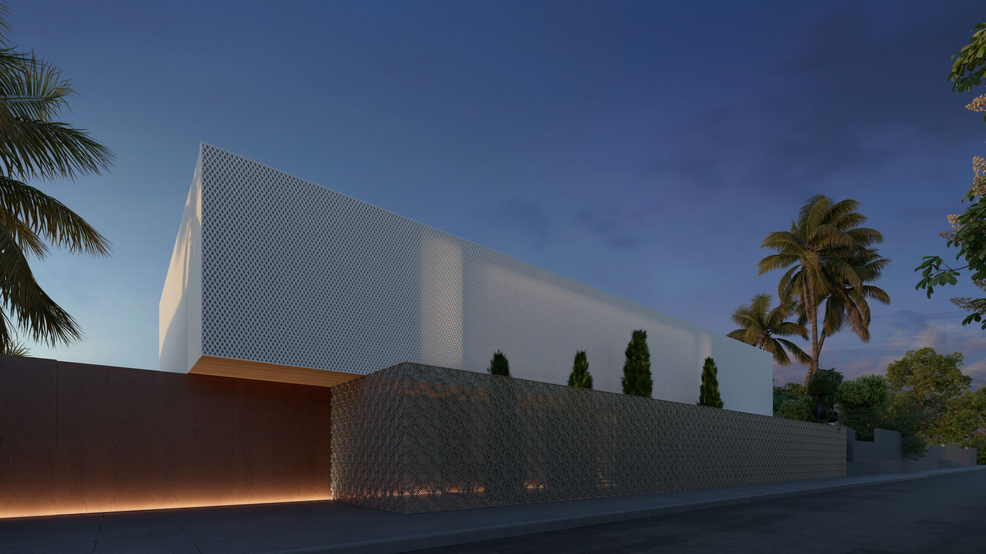 En la planta baja se plantea el acceso principal, un gran estar y comedor, cocina y comedor diario, el acceso al garaje para 2 vehículos y zonas de terraza exterior, piscina y jardín. En planta alta se ubican 4 dormitorios más balcón terraza A las 2 viviendas para renta se accede desde el vial inferior. En ese nivel se ubica las áreas de aparcamiento y el hall de acceso a las viviendas que se desarrollan en planta primera y segunda.