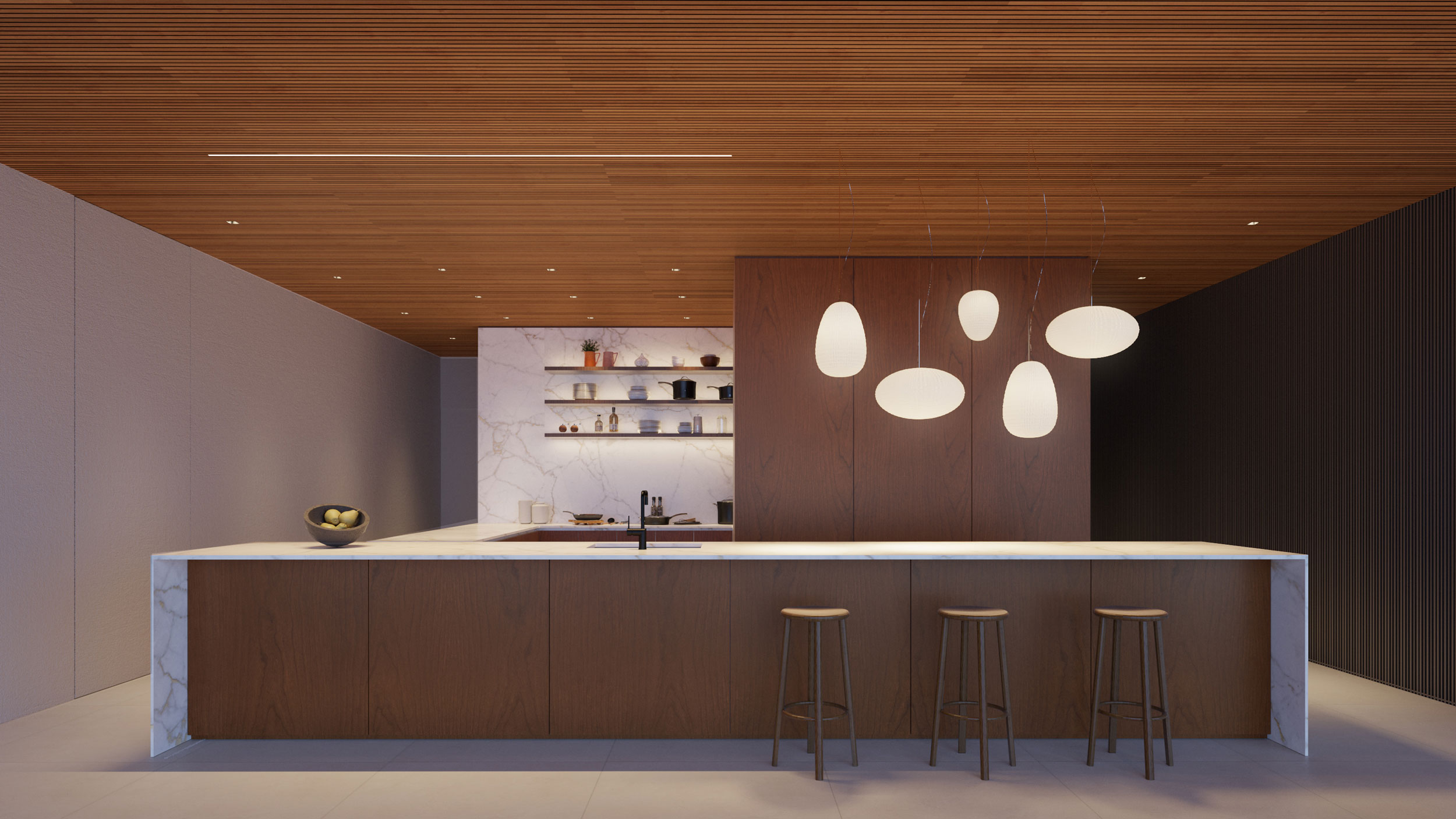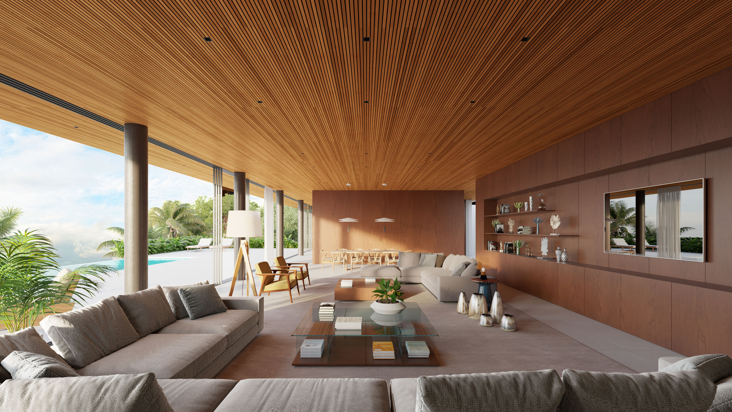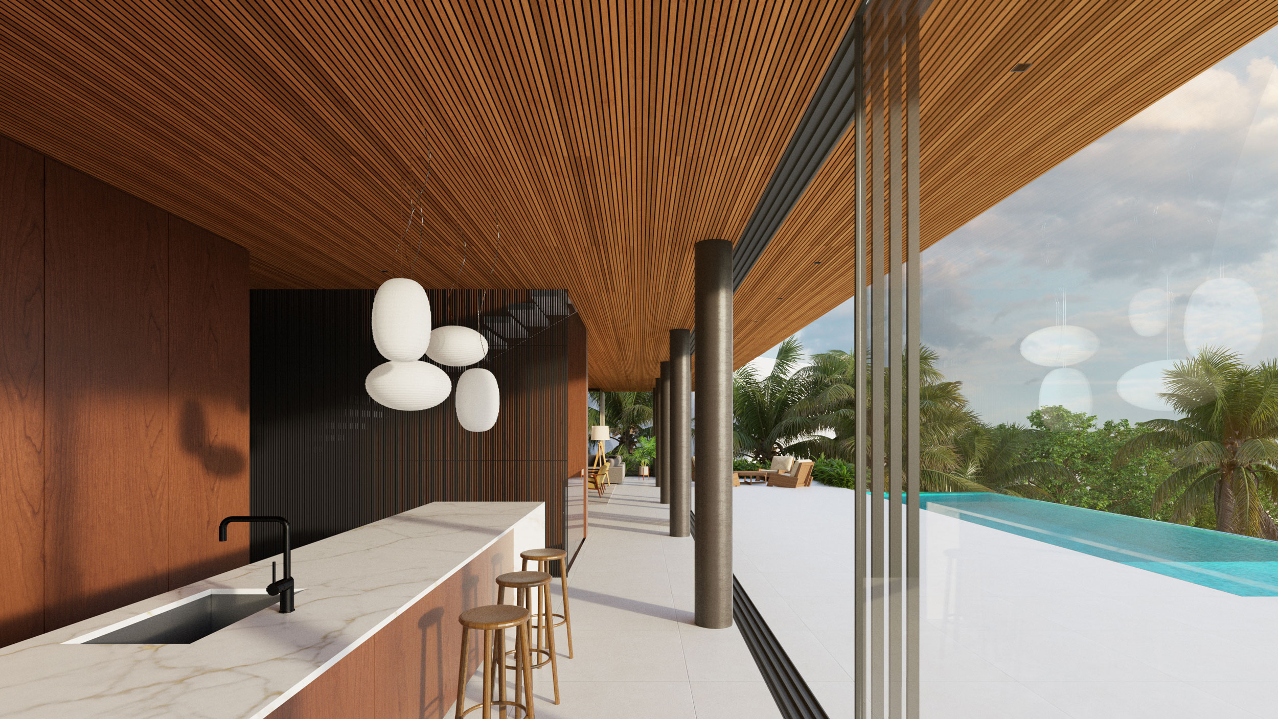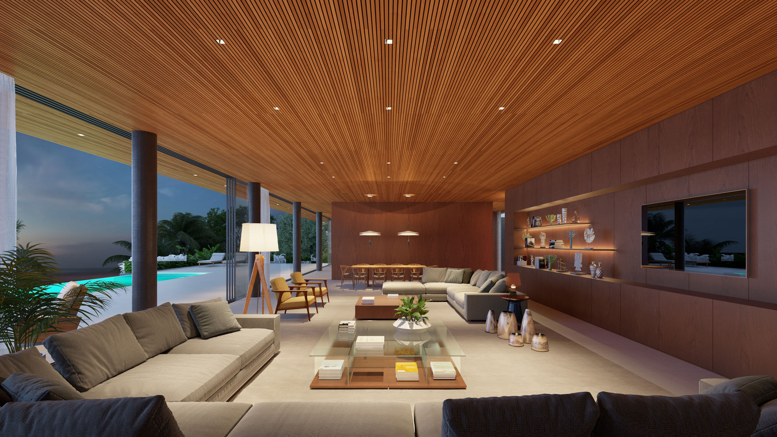 En la planta baja se plantea el acceso principal, un gran estar y comedor, cocina y comedor diario, el acceso al garaje para 2 vehículos y zonas de terraza exterior, piscina y jardín. En planta alta se ubican 4 dormitorios más balcón terraza A las 2 viviendas para renta se accede desde el vial inferior. En ese nivel se ubica las áreas de aparcamiento y el hall de acceso a las viviendas que se desarrollan en planta primera y segunda.